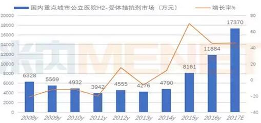 米內(nèi)網(wǎng)數(shù)據(jù)顯示,2016年國(guó)內(nèi)重點(diǎn)城市公立醫(yī)院H2受體拮抗劑用藥金額為1.19億元,同比上一年增長(zhǎng)率為45.62%。據(jù)2017年1~3季度數(shù)據(jù)估算,2017年國(guó)內(nèi)重點(diǎn)城市公立醫(yī)院替丁類(lèi)藥物市場(chǎng)為1.74億元,同比上一年增長(zhǎng)率為46.16%。
